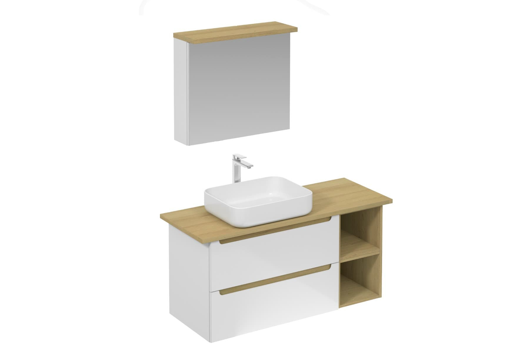 L'ensemble de salle de bain avec lavabo Naturel Stilla en blanc brillant avec des composants de couleur hêtre truffe rendra plus agréables les moments quotidiens passés dans la salle de bain et constitue une combinaison parfaite d'élégance, de qualité et de praticité. Des lignes fines avec des éléments en bois confèrent à cet ensemble un style intemporel. Chaque détail a été soigneusement conçu pour donner à votre salle de bain un aspect élégant et moderne, tout en offrant des espaces de rangement pratiques pour tous vos besoins.