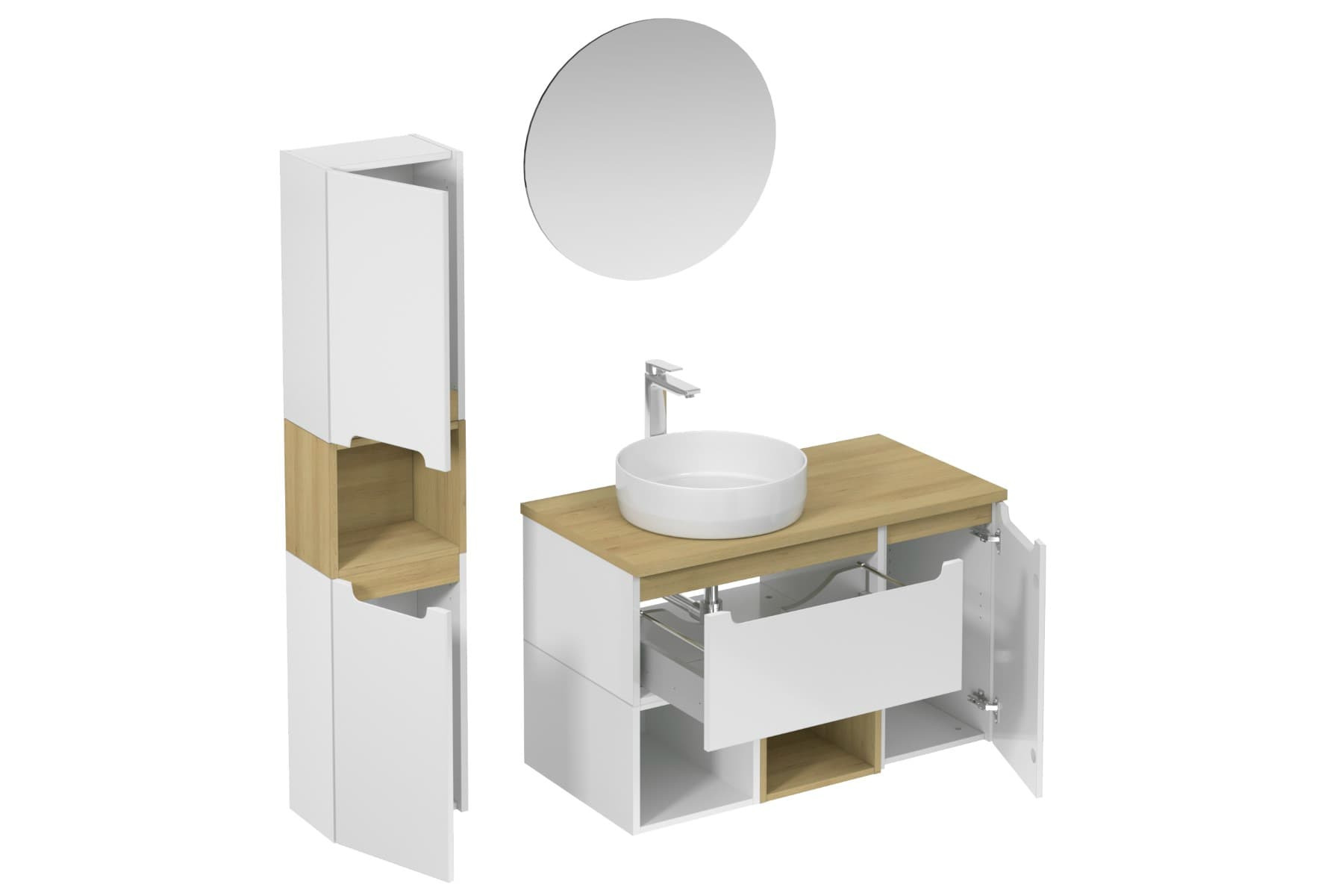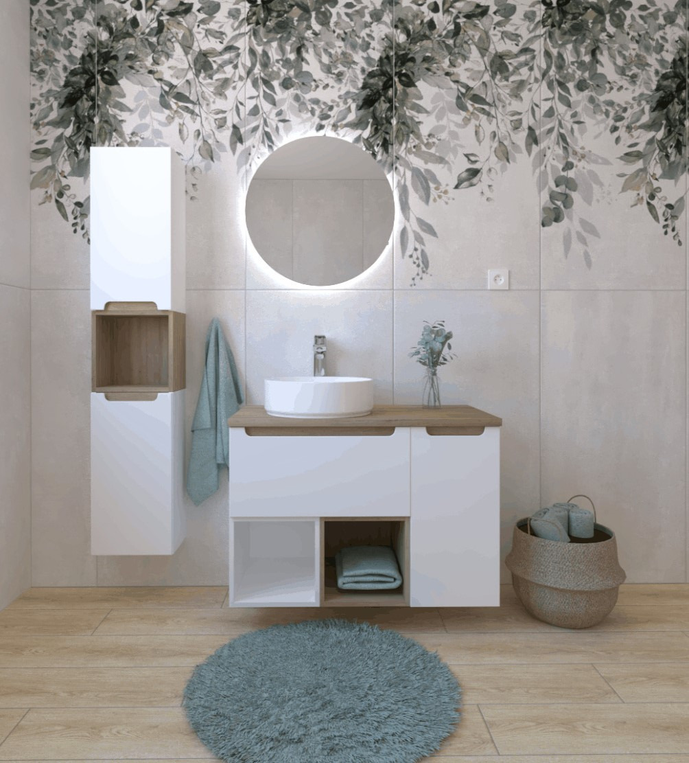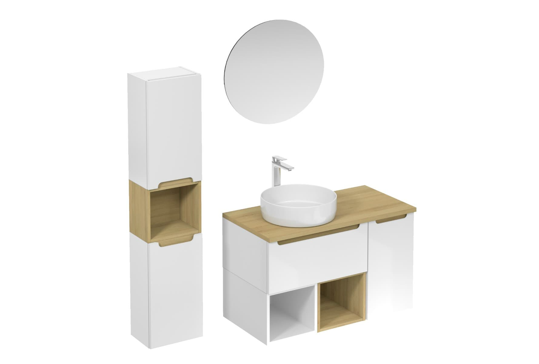 Découvrez l'ensemble de salle de bain Naturel Stilla, associant un vasque blanc brillant à des composants en couleur hêtre.