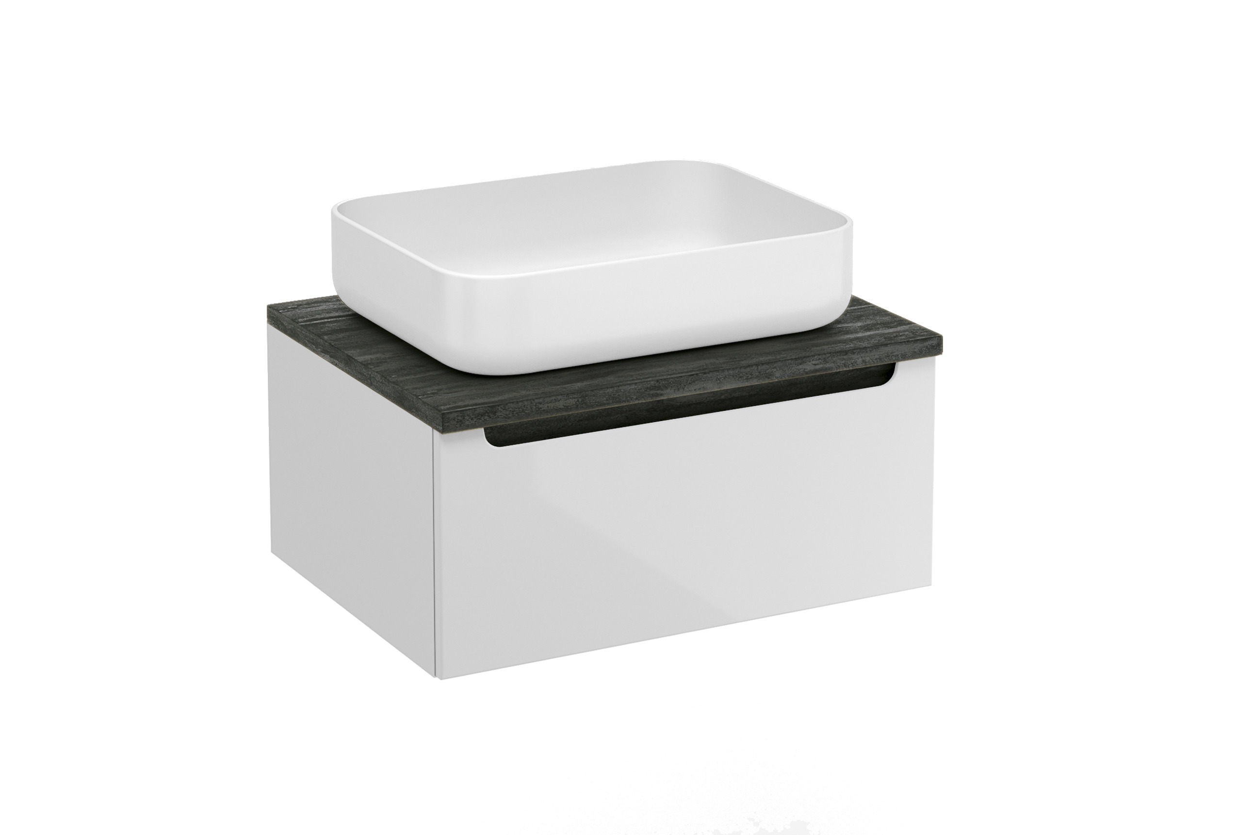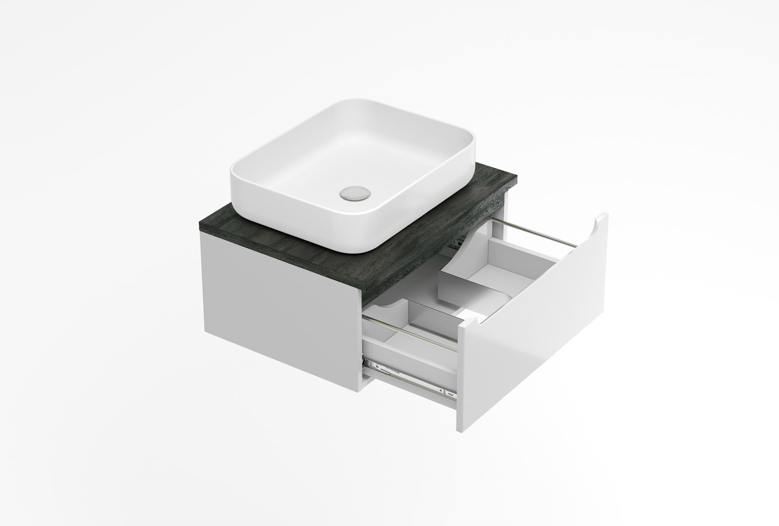 Meuble de salle de bain suspendu Stilla avec un tiroir de dimensions 60x30x45 cm avec plaque de recouvrement de couleur noir béton. L'armoire a fait partie de la collection modulaire STILLA et peut être combinée avec des armoires et des étagères supplémentaires. Cette solution vous permet d'obtenir plus d'espace de rangement pour tous les accessoires de salle de bain.