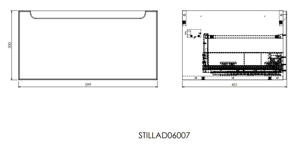 Meuble de salle de bain suspendu Stilla de 60x30x45 cm, livré démonté. Avec un grand tiroir et un élégant lavabo en céramique Verso VERSO60 de 61,5x46,5x7 cm.