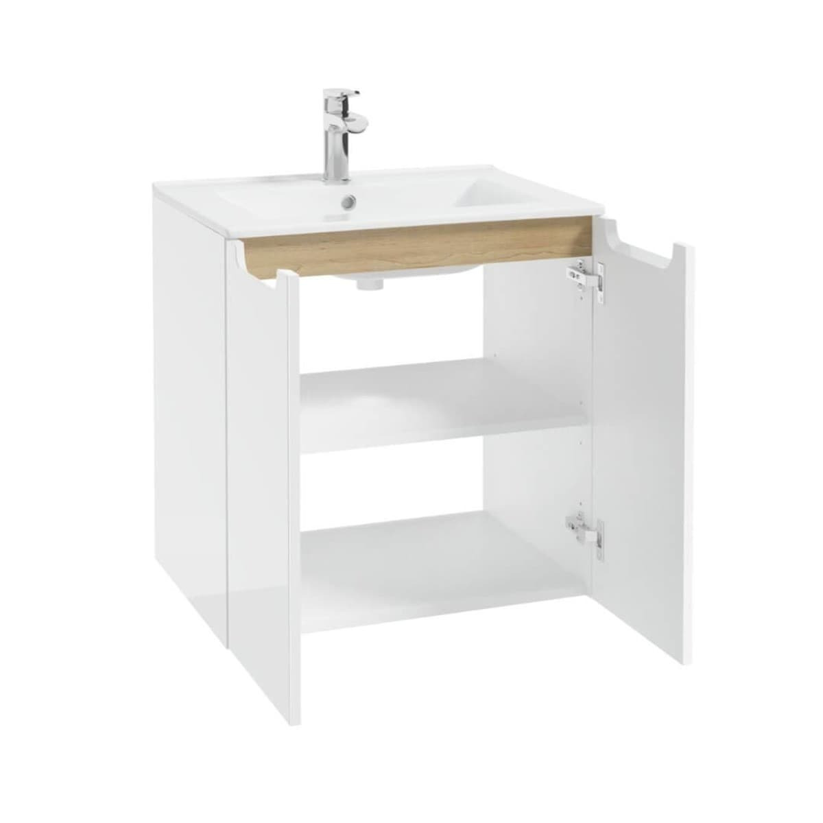 Meuble de salle de bain suspendu avec lavabo en céramique M6046 en blanc. Dimensions 60x60x45 cm. Face avant en mélaminé laqué. Le produit est livré démonté, avec instructions de montage.