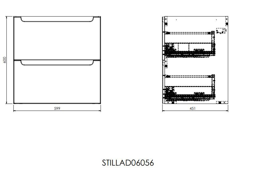 Meuble de salle de bain suspendu Stilla avec deux tiroirs de dimensions 60x60x45 cm avec plaque de recouvrement. L'armoire fait partie de la collection modulaire STILLA et peut être combinée avec des armoires et des étagères supplémentaires. Cette solution vous permet d'obtenir plus d'espace de rangement pour tous les accessoires de salle de bain.