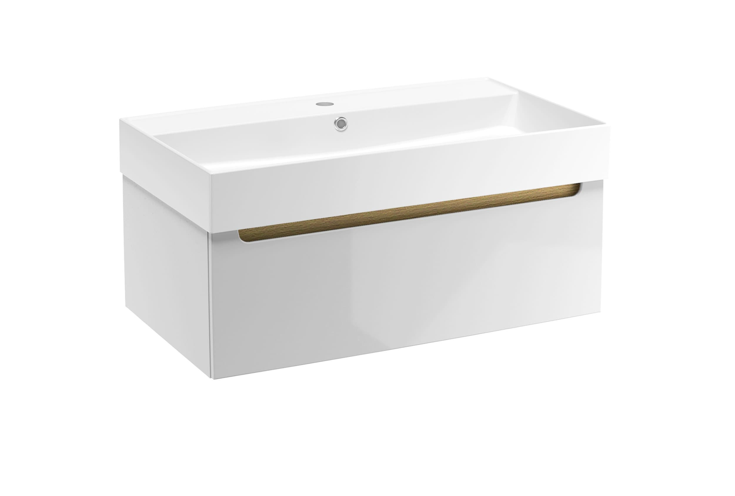 Meuble de salle de bain suspendu avec lavabo en céramique SATINF8046 en blanc. Dimension 80x30x45 cm. Face avant en MDF laqué. Tiroir avec découpe pour siphon. Le produit est livré démonté, avec instructions de montage.