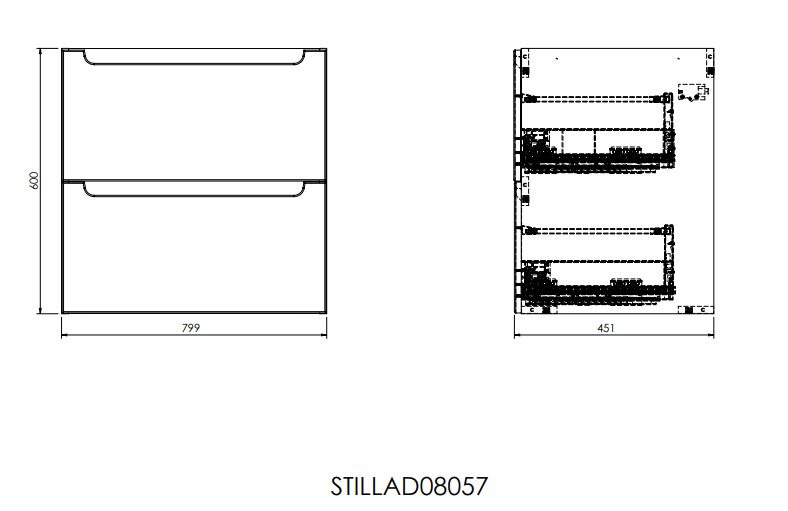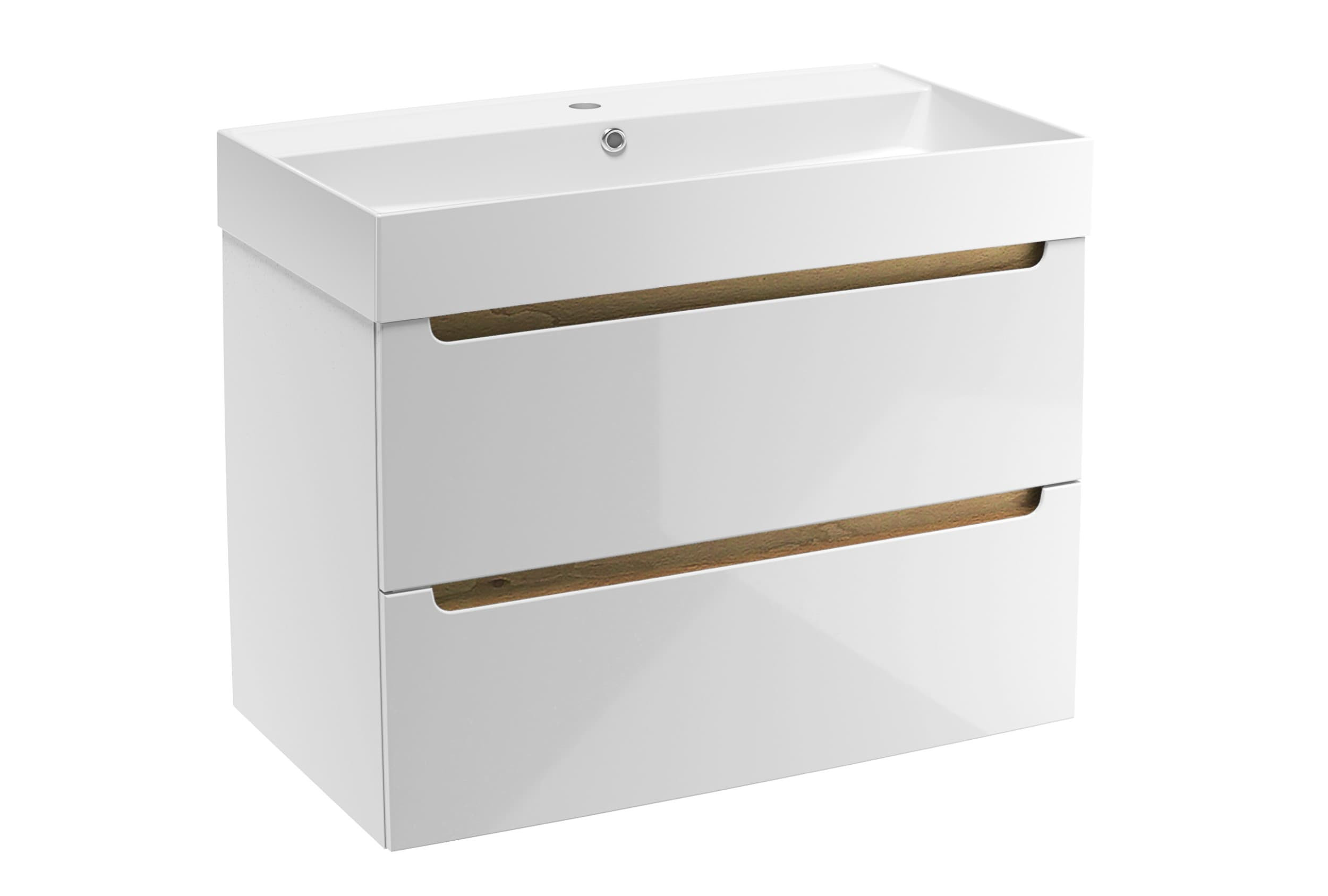 Meuble de salle de bain suspendu avec lavabo en céramique SATINF8046 en blanc. Dimensions 80x60x45cm. Face avant en mélaminé laqué. Tiroir supérieur avec découpe pour siphon. Le produit est livré démonté, avec instructions de montage.