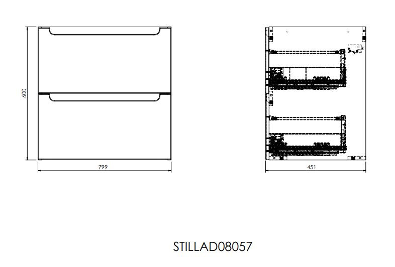 Meuble de salle de bain suspendu Stilla avec deux tiroirs de dimensions 80x60x45 cm avec élégant lavabo Verso VERSO80. Le meuble fait partie de la collection modulaire et peut être combiné avec le plateau de la couleur de votre choix. En choisissant un plateau plus large que le meuble, il est possible de créer un agencement individuel en ajoutant d'autres meubles et des caissons de la collection. Cette solution vous permet d'obtenir plus d'espace de rangement pour tous les accessoires de salle de bain.