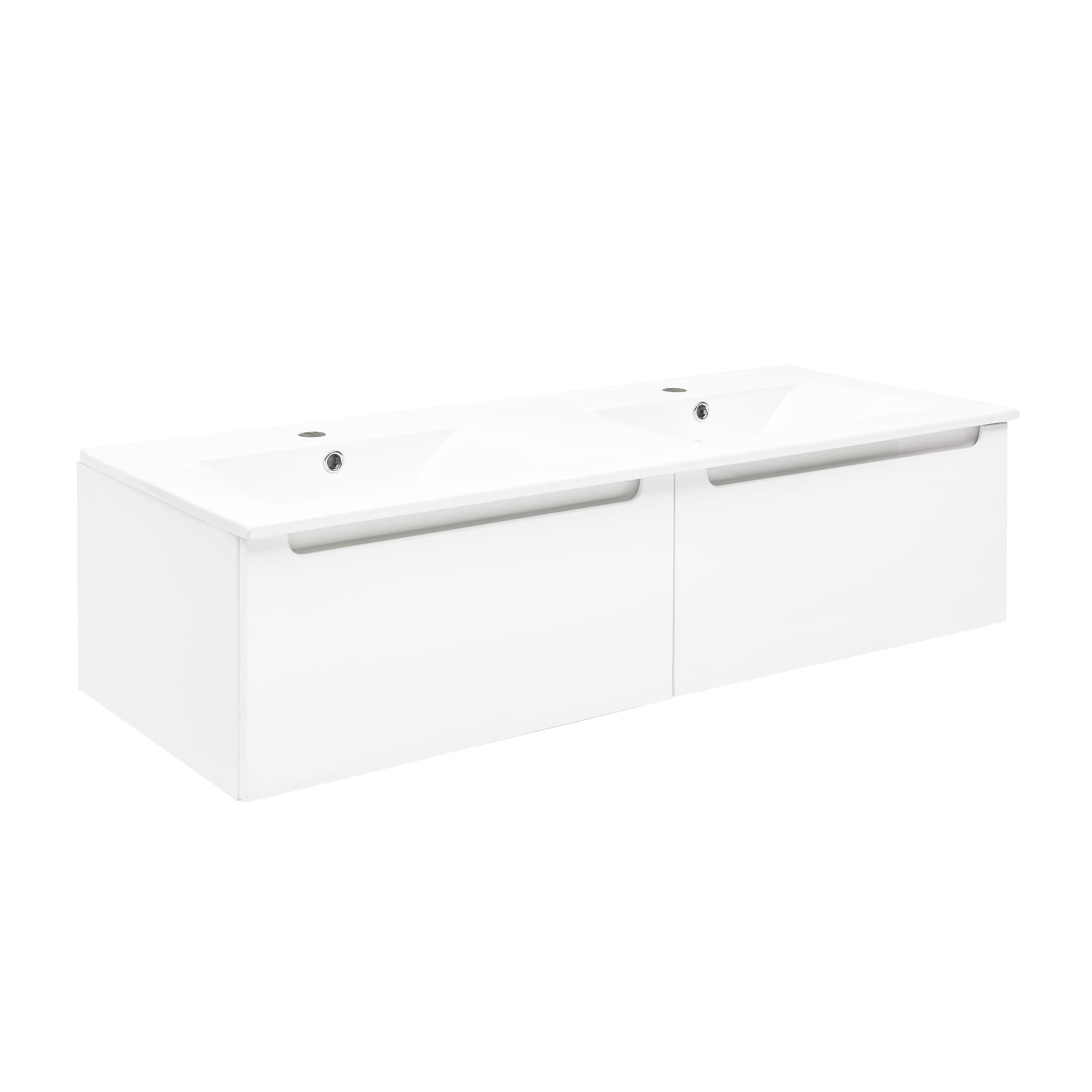 Deux meubles de salle de bain suspendus Stilla avec un tiroir de dimensions totales 120x30x45 cm avec un élégant double lavabo Modena M2N12046. L'armoire fait partie de la collection modulaire STILLA et peut être combinée avec des armoires supplémentaires, des boîtes à étagères et des plaques de recouvrement de votre choix. Cette solution vous permet d'obtenir plus d'espace de rangement pour tous les accessoires de salle de bain.