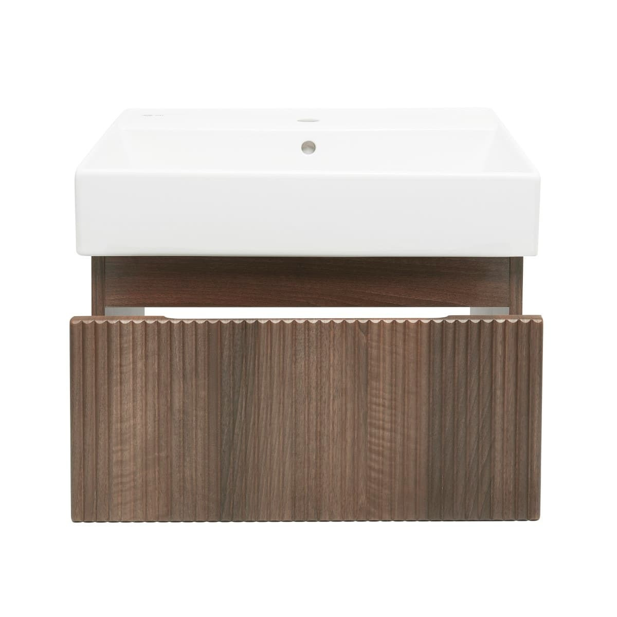 Meuble de salle de bain suspendu avec lavabo en céramique décor noyer avec surface mate mesurant 58x30x44,8 cm. Surface en style filmé.