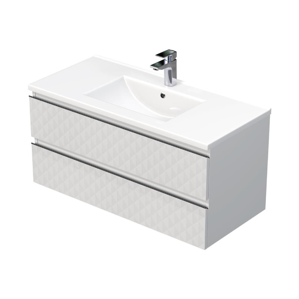 Caractéristiques du meuble de salle de bain suspendu 2 tiroirs 100x47,5x46 cm avec lavabo en céramique, décoration pyramidale 3D, Swiss Aqua Technologies Cube Way, blanc mat (CUBE3D1002ZBMOD) :