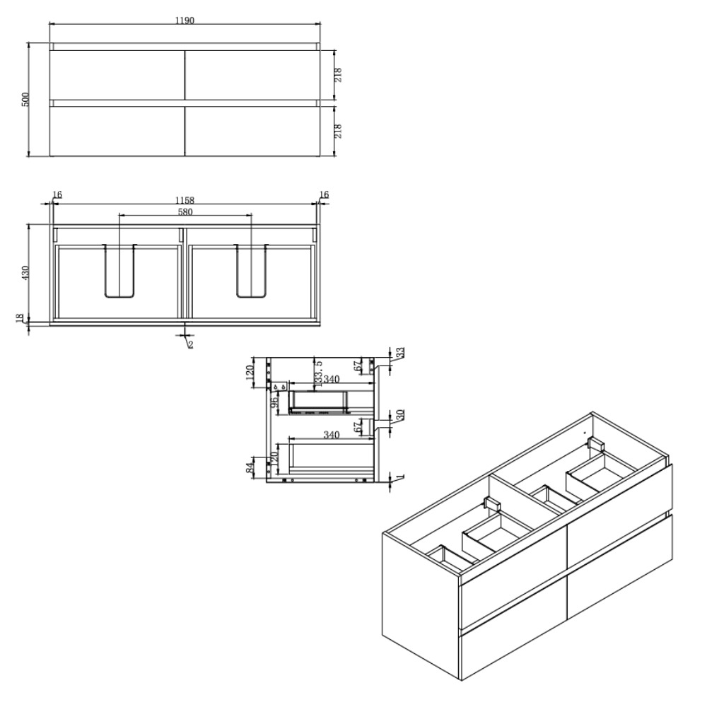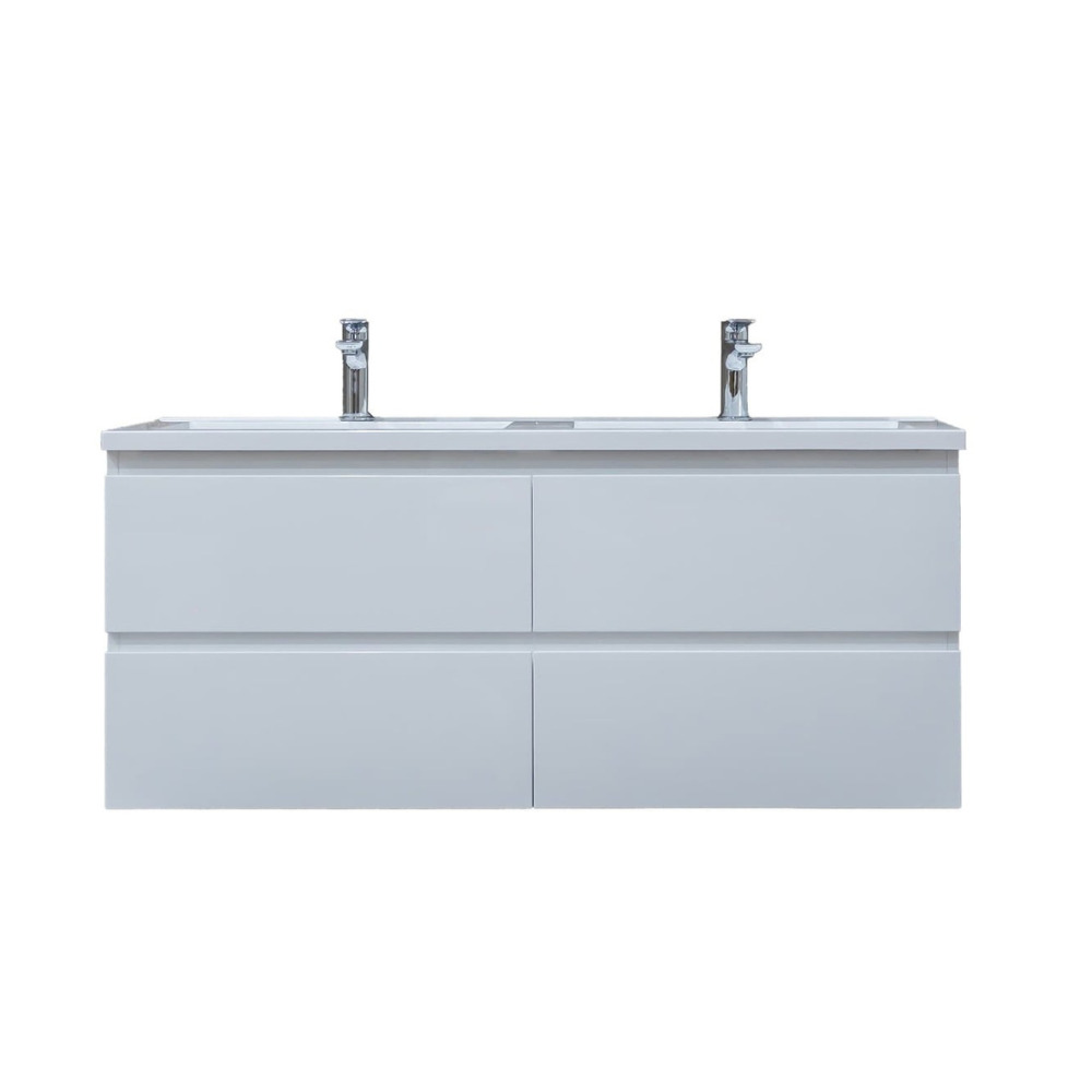 Caractéristiques du meuble de salle de bain suspendu 119x50x45 cm 2 tiroirs avec double vasque en marbre coulé, Swiss Aqua Technologies B-Way, blanc brillant (BWAY2120WU) :