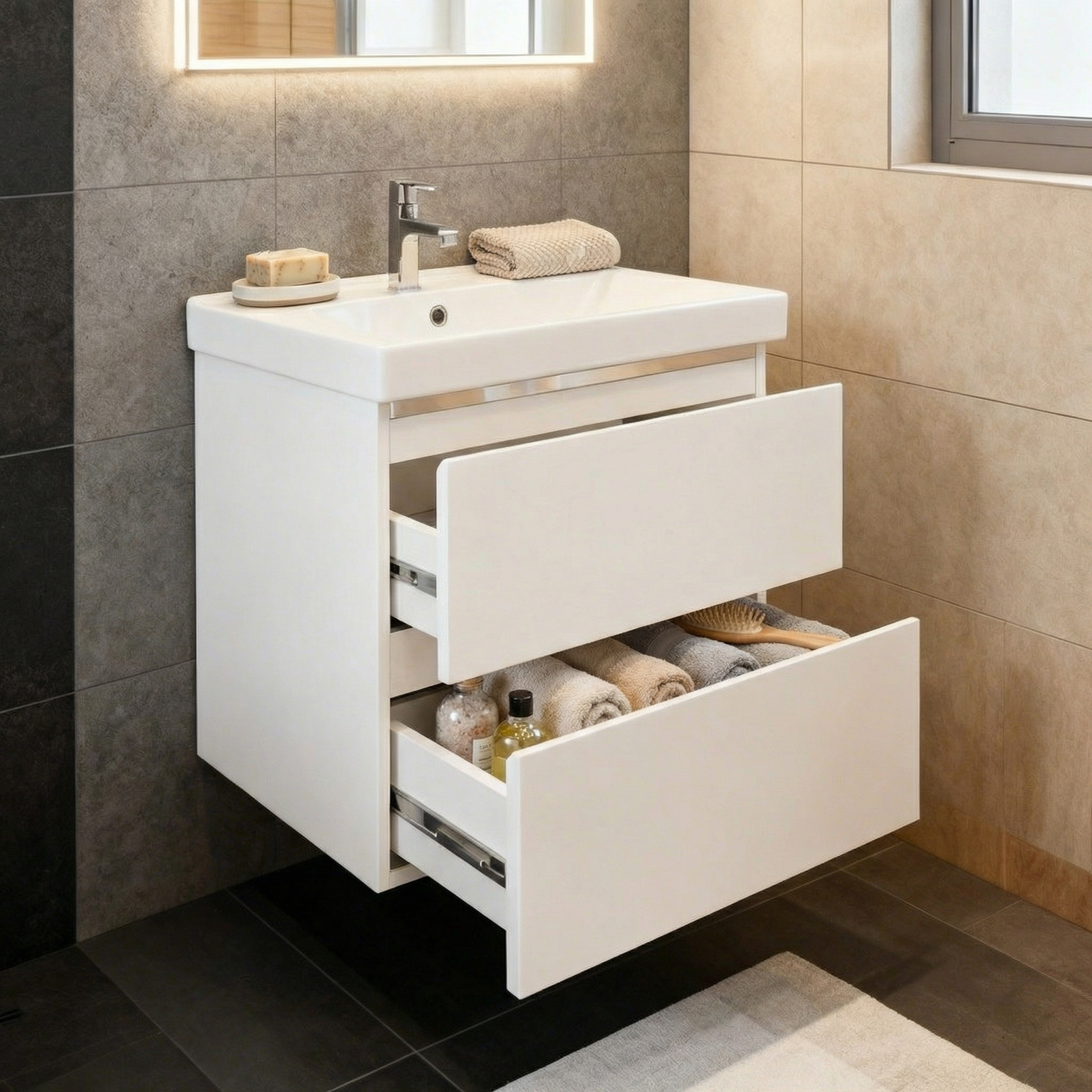 Le meuble est équipé de 2 tiroirs avec espace de rangement, parfaits pour organiser les produits du quotidien tout en gardant une salle de bain propre et fonctionnelle.