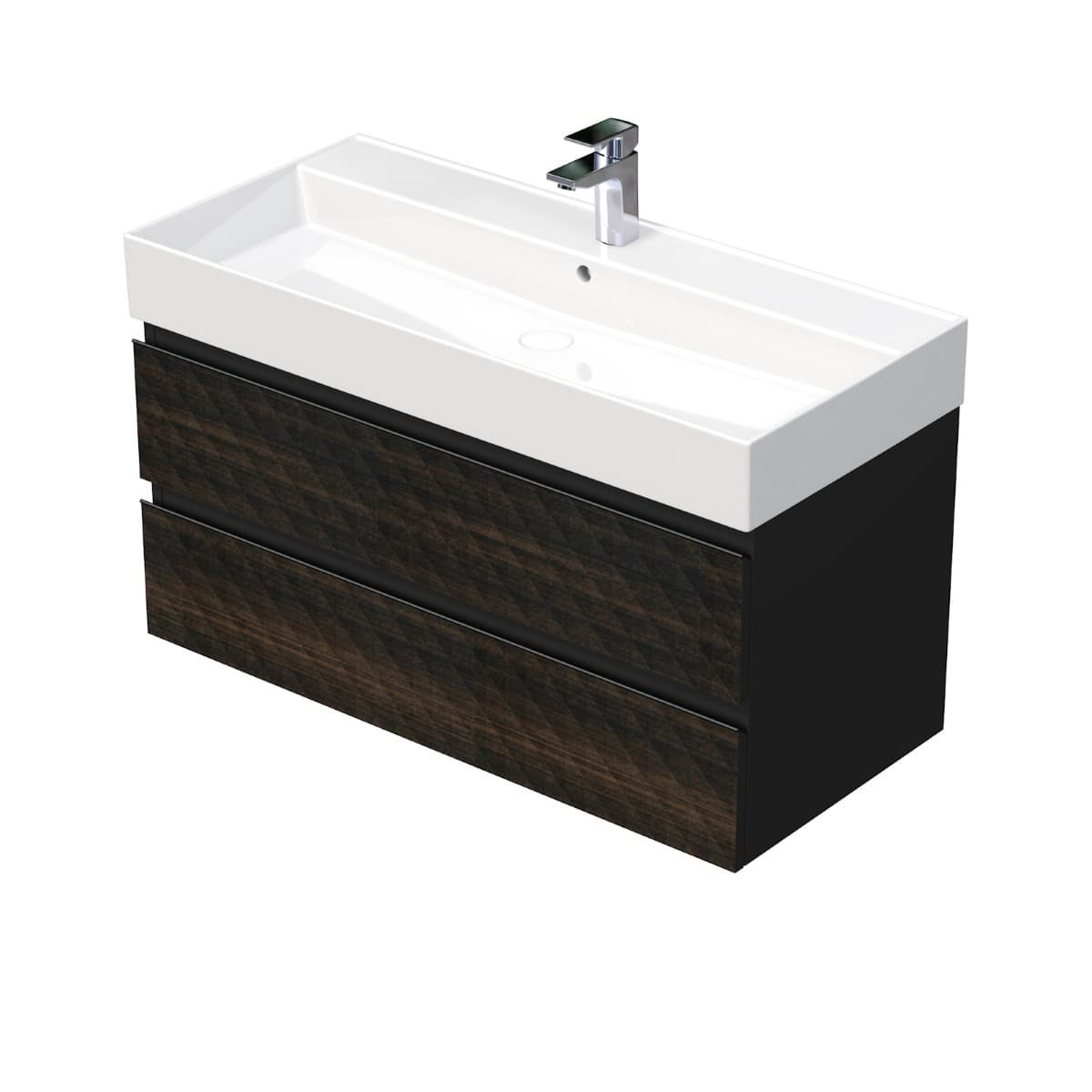 Caractéristiques du meuble de salle de bain suspendu 2 tiroirs 100x47,5x46 cm avec lavabo en céramique, décoration pyramidale 3D, Swiss Aqua Technologies Cube Way, marron mat (CUBE3D461002ZHSAT) :