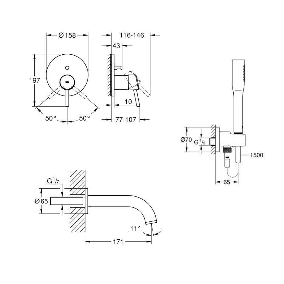 Caractéristiques du Set Mitigeur mécanique et corps d'encastrement + Bec bain Atrio + Douchette stick 1 jet, Chrome, Grohe Concetto (24054Perfect-Bain) :
