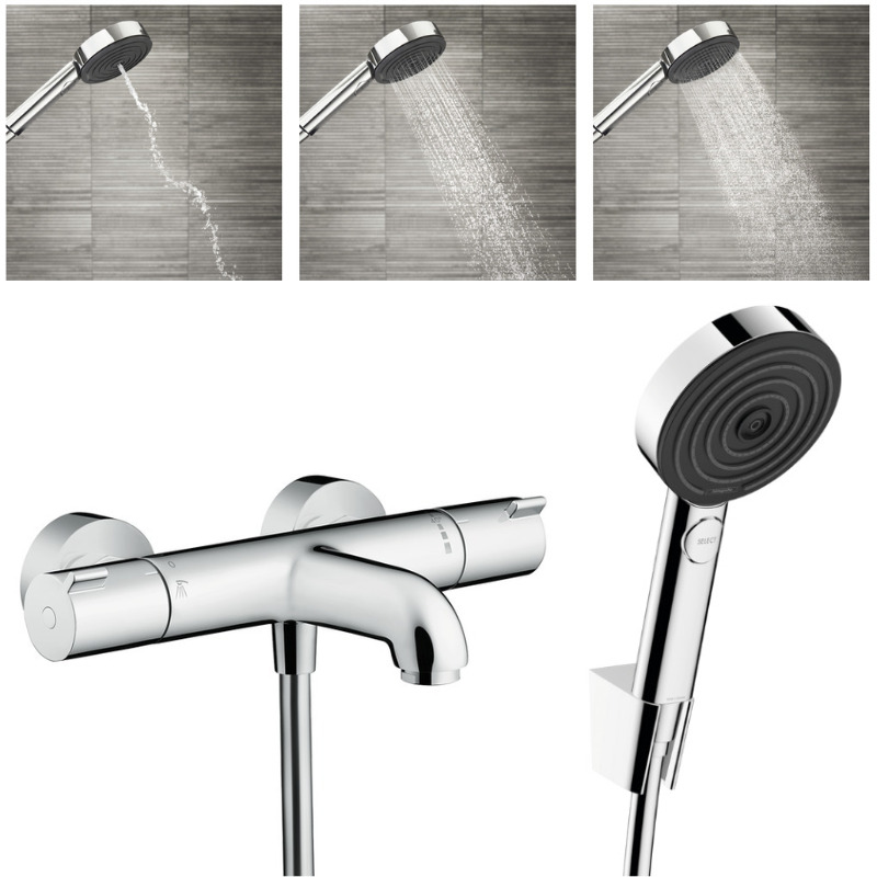 Hansgrohe Ecostat Set Mitigeur Thermostatique bain/douche + Douchette à main 105mm 3 jets + Flexible douche 160cm + Support mural, Chrome