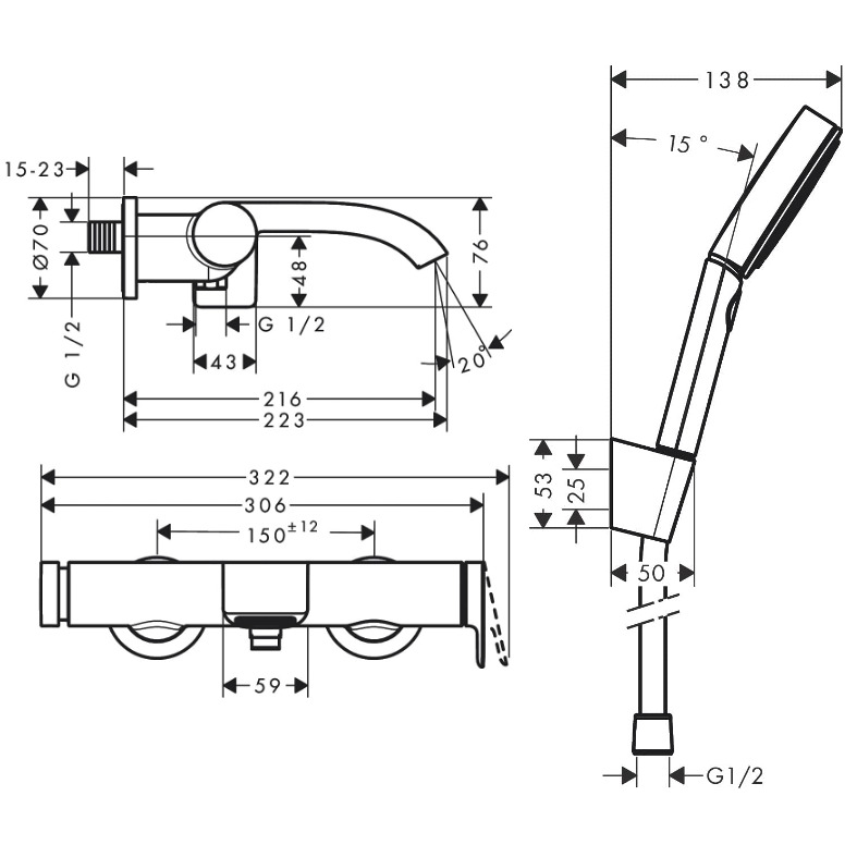 Hansgrohe Vivenis Pulsify Set Mitigeur bain/douche, bec cascade + Douchette 3 jets Relaxation avec support et flexible (75420670-Pulsify2)