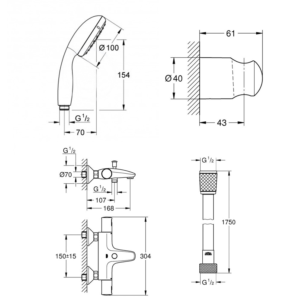 Caractéristiques du Set de douche mitigeur bain/douche thermostatique + Douchette 2 jets + support mural + Flexible 1750 mm, noir mat :