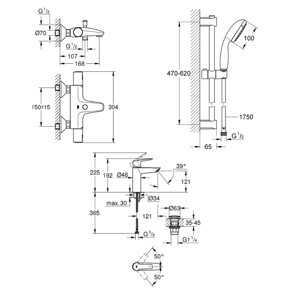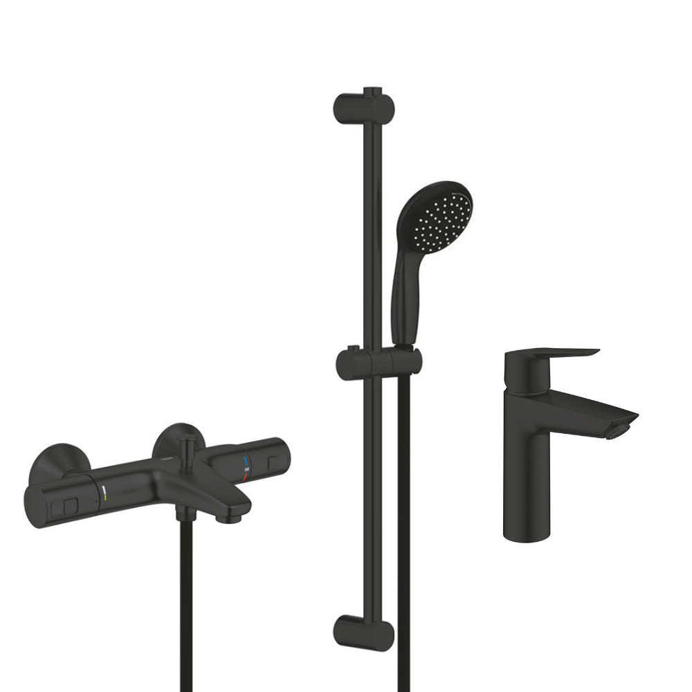 Grohe Set de douche mitigeur bain/douche thermostatique + Douchette 2 jets + Barre 600 mm + Mitigeur lavabo taille M, noir mat