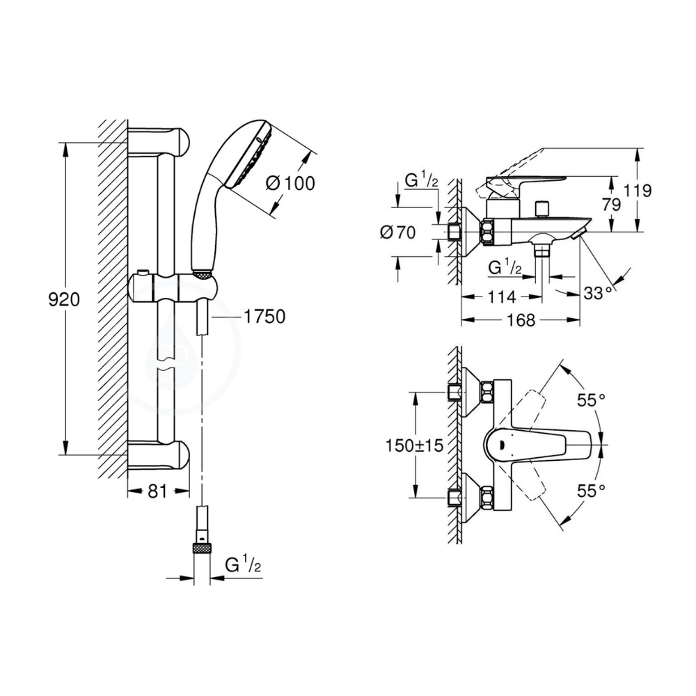 Caractéristiques de l'ensemble de douche 3 jets Grohe Tempesta 100 + mitigeur monocommande bain/douche, Grohe BauEdge, chrome (23914001-28789002) :