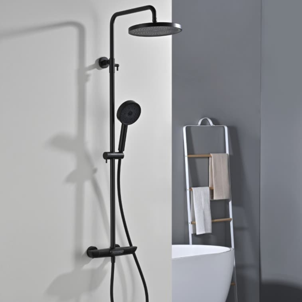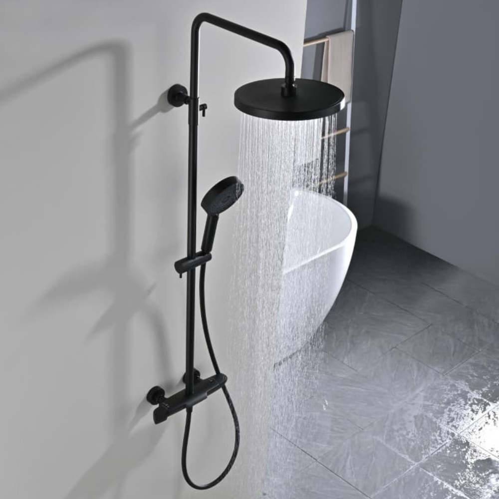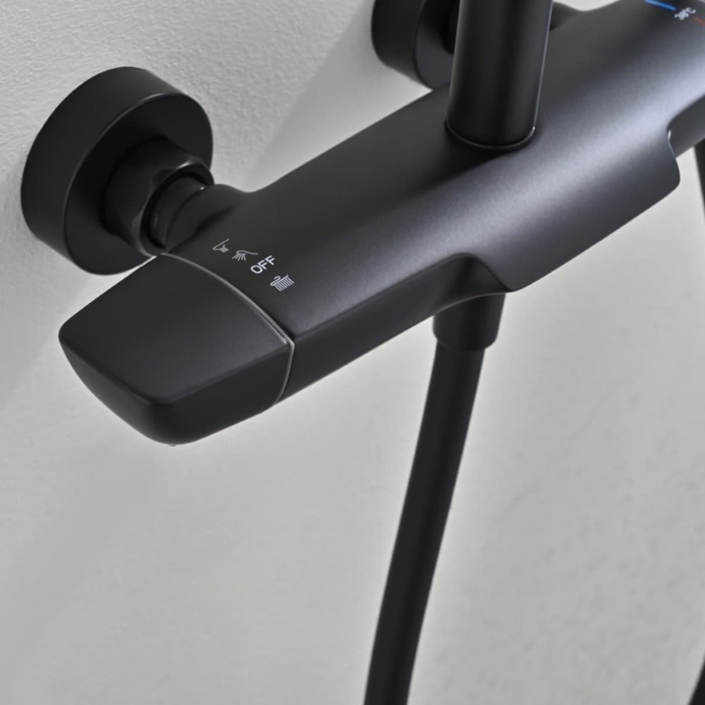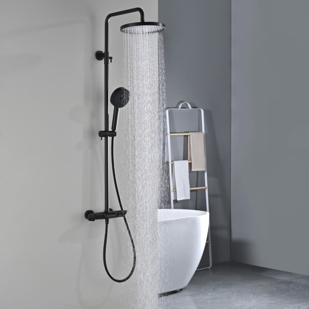 Caractéristiques de l'ensemble bain/douche 3 jets avec mitigeur thermostatique de baignoire + douche de tête + douchette à main, Swiss Aqua Technologies, noir mat (SATSSTVKC) :