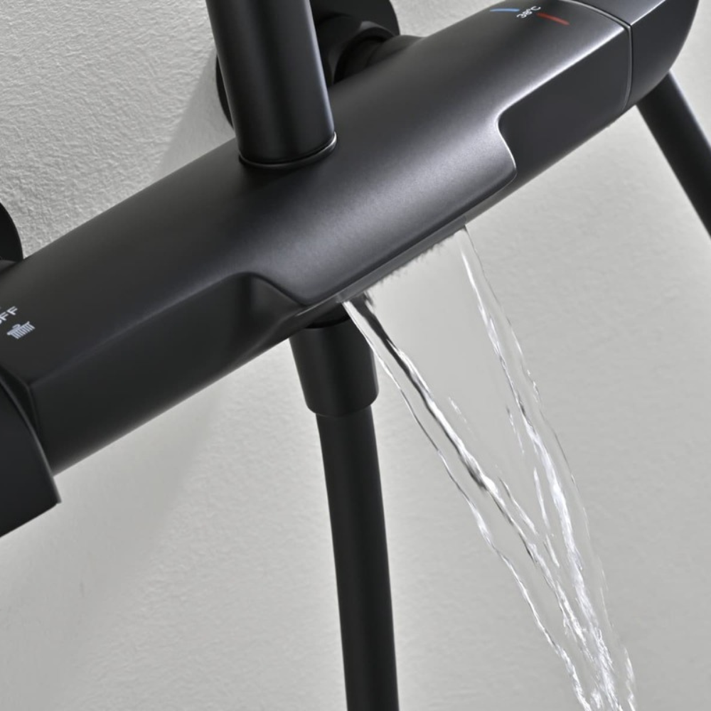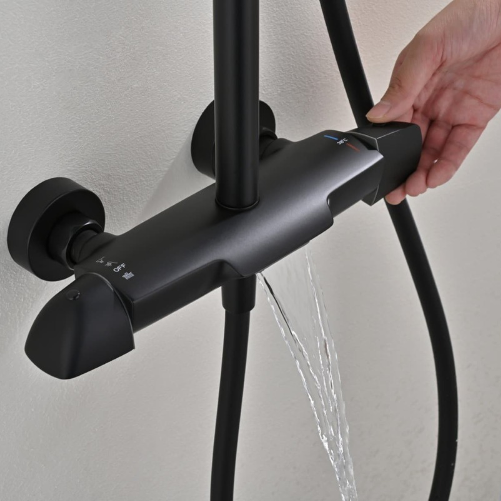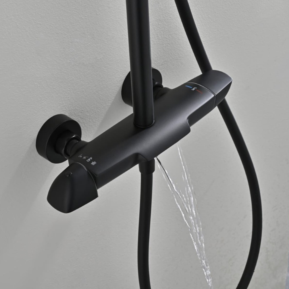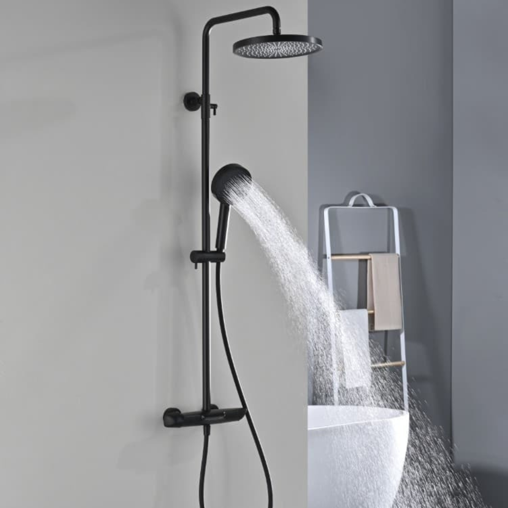 Caractéristiques de l'ensemble bain/douche 3 jets avec mitigeur thermostatique de baignoire + douche de tête + douchette à main, Swiss Aqua Technologies, noir mat (SATSSTVKC) :
