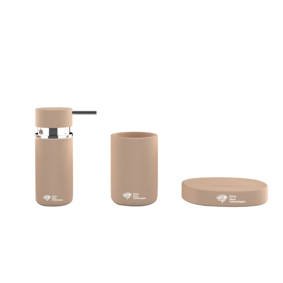 Swiss Aqua Technologies Set d'accessoires Infinitio Distributeur de savon + Porte savon + Gobelet, En céramique, Marron mat