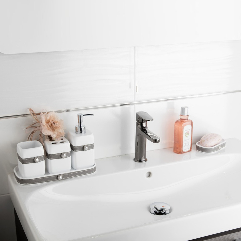 Le set BELA de Swiss Aqua Technologies agrémente la salle de bain avec son côté moderne. Les accessoires, entourés d'une fine lanière de simili cuir gris, apportent une touche d'élégance aux pièces d'eau.