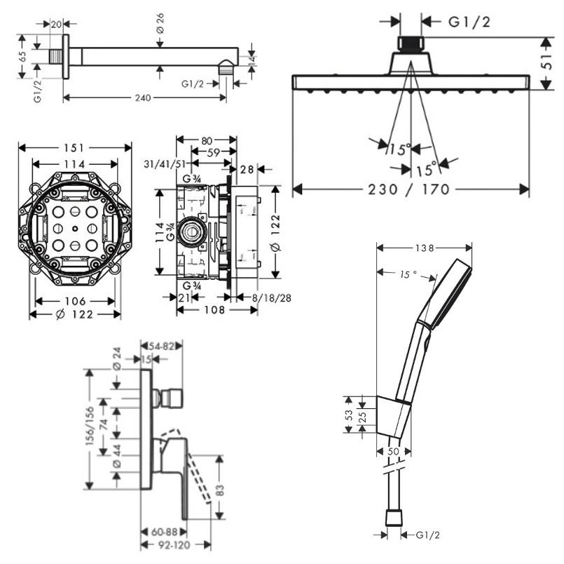 - Diamètre douche de tête (mm): 23