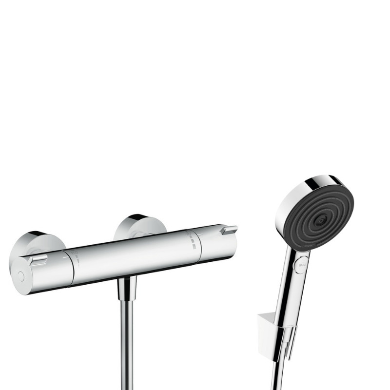 Hansgrohe Ecostat Set Mitigeur thermostatique douche + Douchette à main XXL 105mm 3 jets + Flexible de douche 125cm, support mural, Chrome