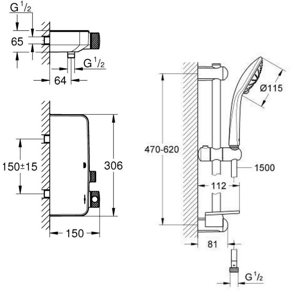 Caractéristiques du Set Mitigeur thermostatique douche + Set de douche, 3 jets, Grohe Euphoria Massage, chrome (34719000-Euphoria2) :