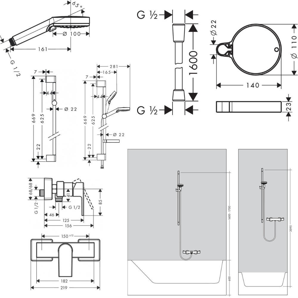 Caractéristiques du Pack Mitigeur de douche Hansgrohe Vernis Shape + Set de douche Crometta + douchette 2 jets, barre et porte-savon Hansgrohe (71650000-Crometta2) :