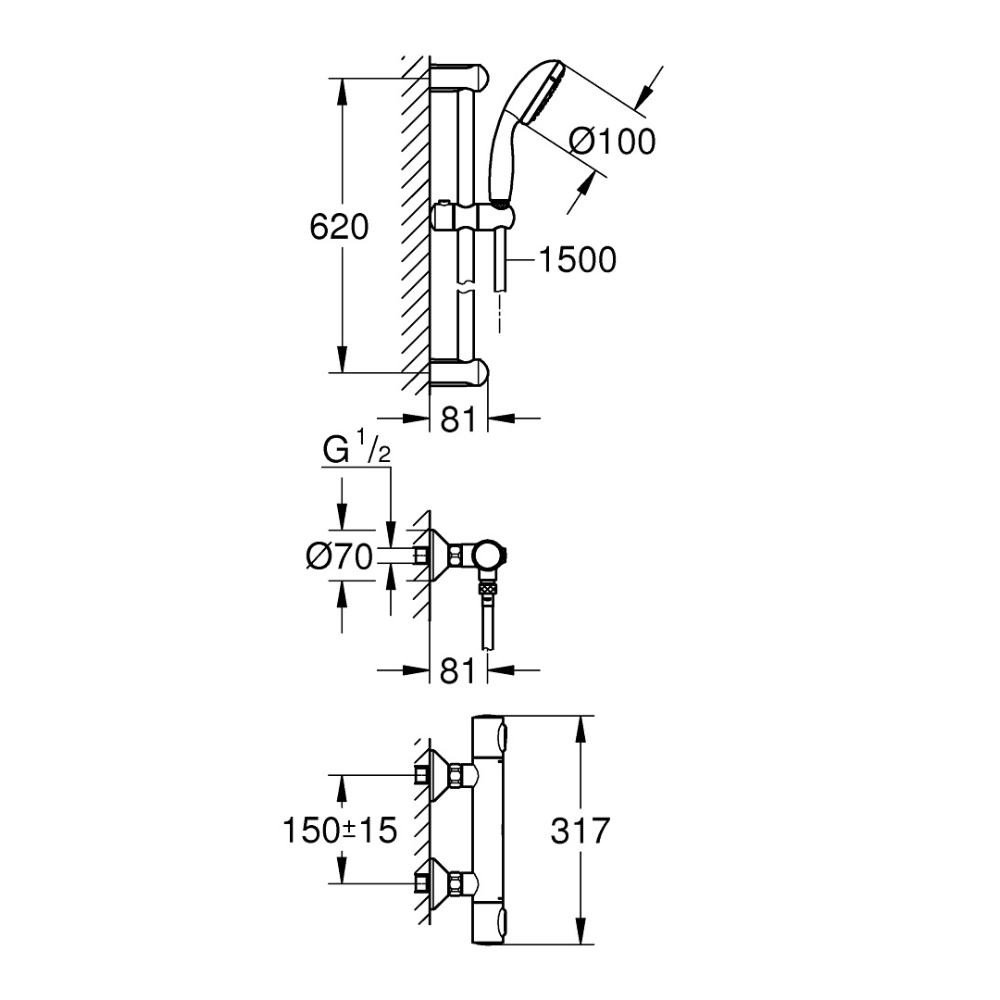 Caractéristiques du set de douche pour basse pression avec mitigeur thermostatique 1/2", Grohe Grohtherm 500, chrome (G34806000) :