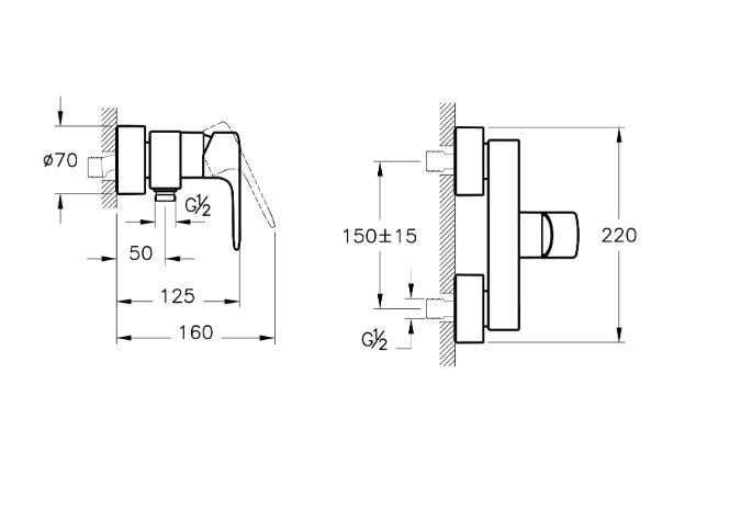 Mitigeur de douche mural sans set de douche en finition chromée. Pas du robinet 150 Mp. En VOVO Brillant.