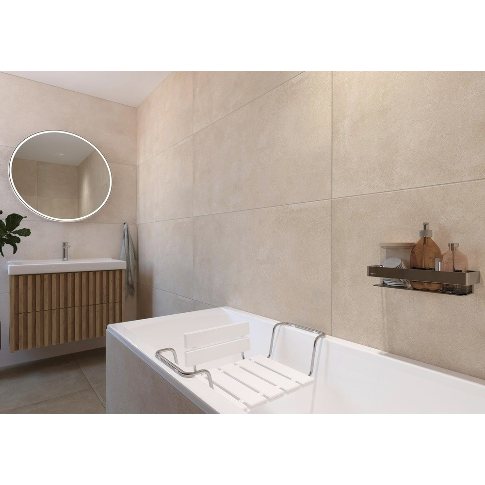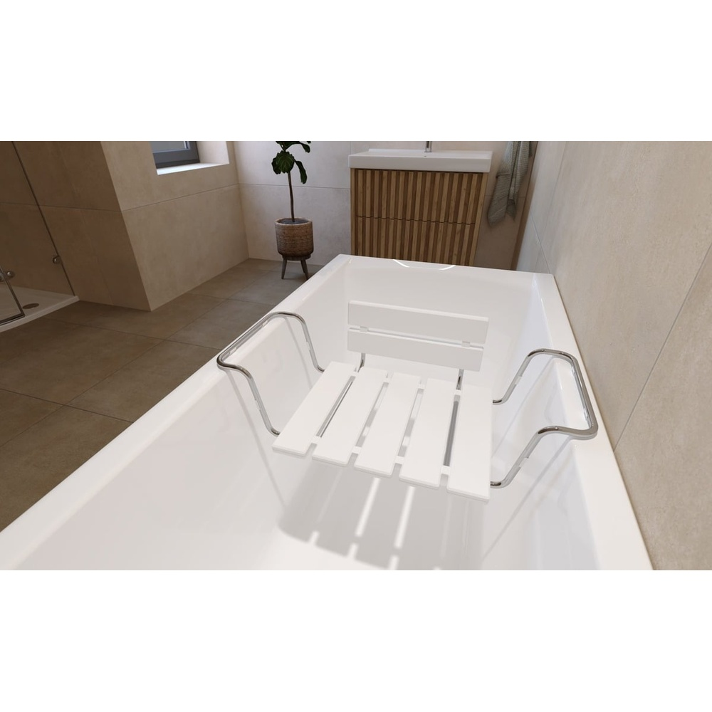 Siège de baigoire avec dossier blanc. Cet accessoire de salle de bain de la marque SAT est réglable en largeur de 73 à 88 cm et est fabriqué en métal et plastique. Sa capacité de charge maximale est de 110 kg. Il s'installe par suspension au bord de la baignoire.