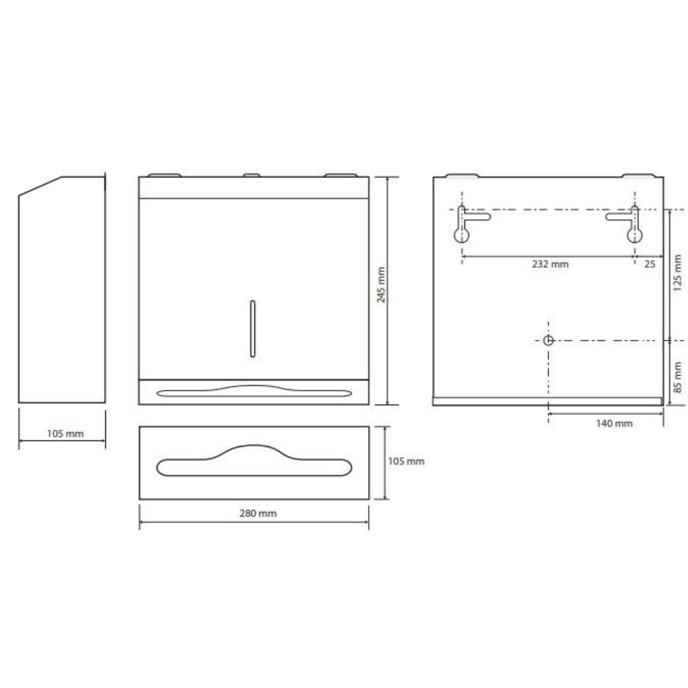 Distributeur de serviettes en papier mural verrouillable pratique de dimensions 270 x 265 Mp. Finition de surface : Acier inoxydable. Nombre maximum d'essuie-mains : 350 Métaux.