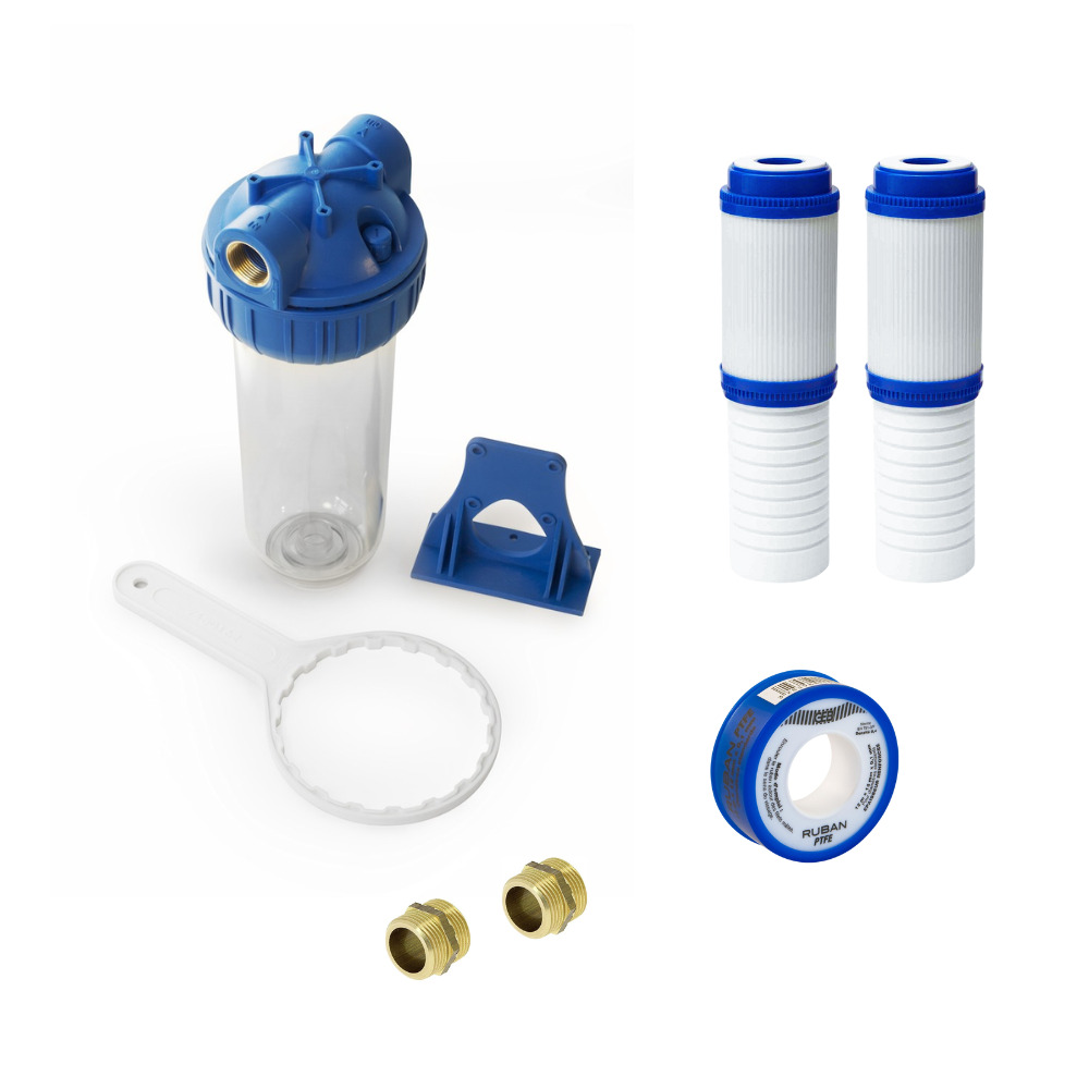 - 2 filtres SATCPC1010M à deux étapes, dont un étage contenant du charbon actif, pour éliiner efficacement les impuretés indésirables, la boue, les sédiments jusqu'à 10 microns et pour améliorer le goût et l'odeur de l'eau.