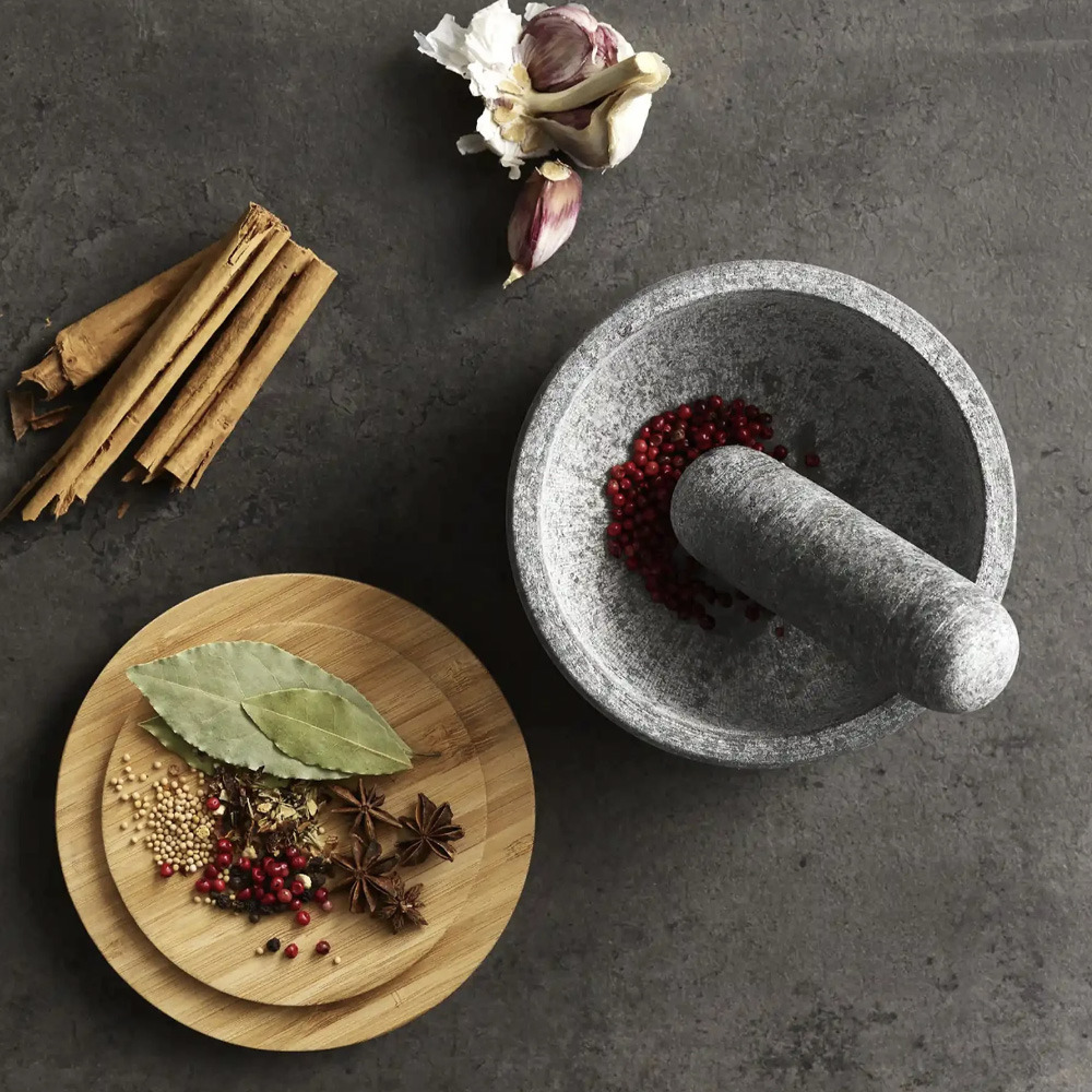 Caractéristiques du pilon et mortier en granit avec couvercle en bambou (20176):