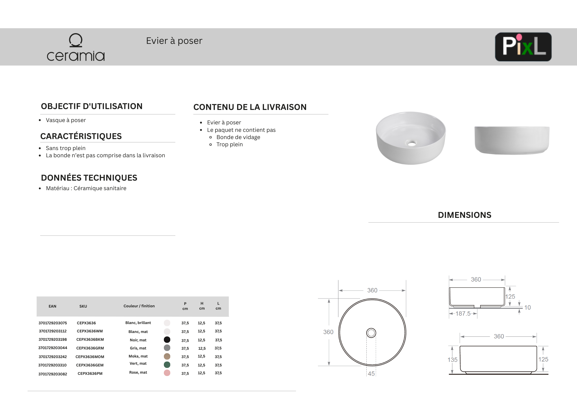 Caractéristiques de la vasque à poser Infinitio 36 x 12,5 cm, sans trop-plein, Ceramia PixL, vert mat (CEPX3636GEM) :