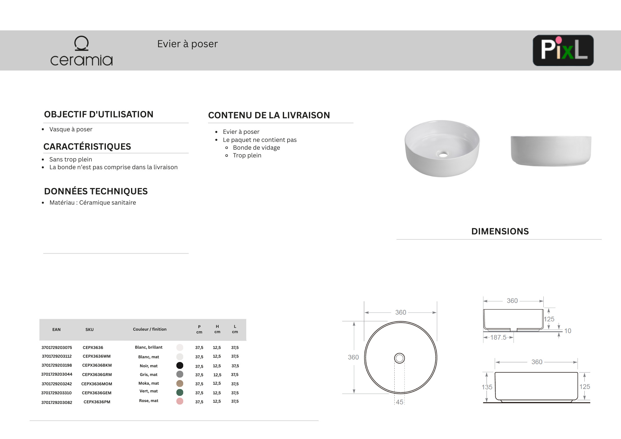 Caractéristiques de la vasque à poser 36 x 12,5 cm, sans trop-plein, Ceramia PixL, blanc mat (CEPX3636WM) :