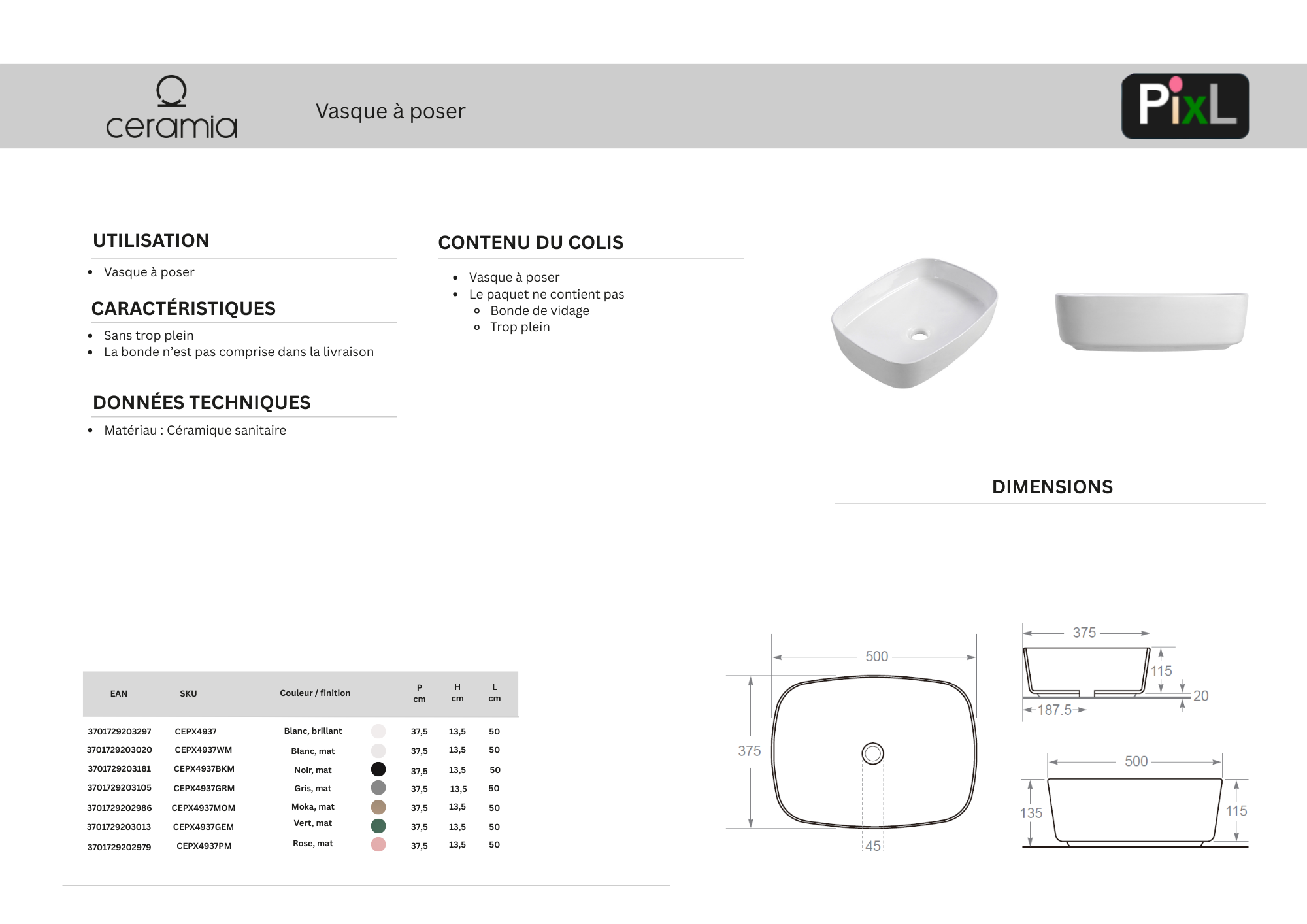 Caractéristiques de la vasque à poser Infinitio 50 x 37,5 x 13,5 cm, sans trop-plein, Ceramia PixL, moka mat (CEPX4937MOM) :