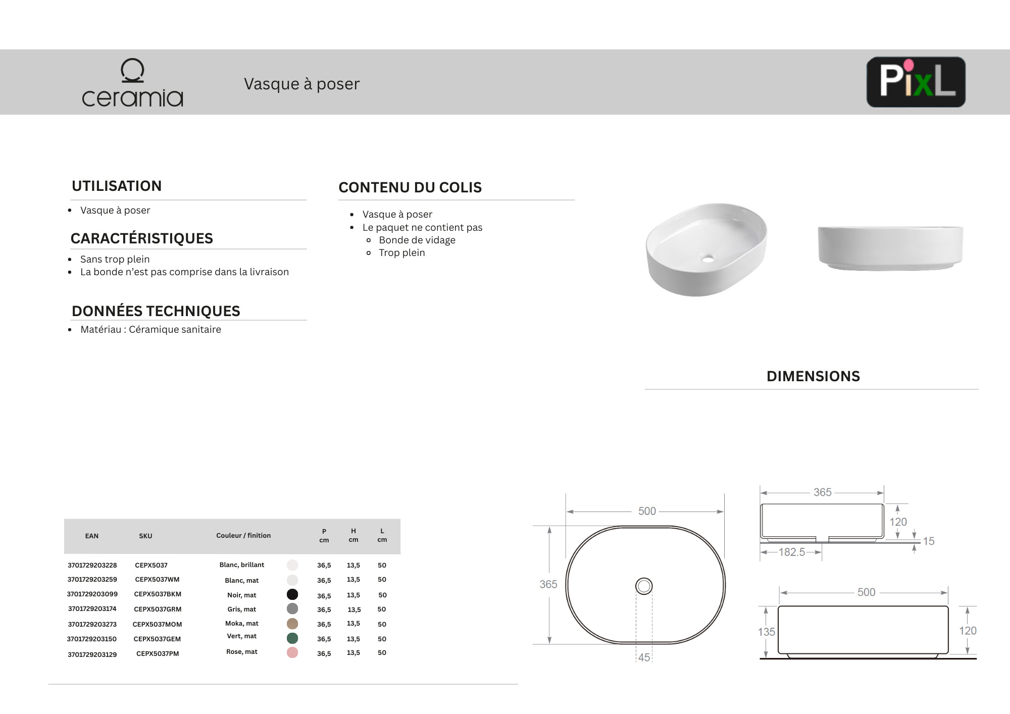 Caractéristiques de la vasque à poser oval 50 x 36,5 x 12 cm, sans trop-plein, Ceramia PixL, blanc brillant (CEPX5037) :