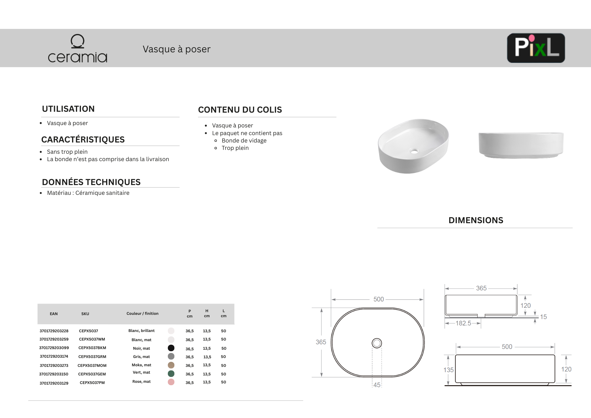 Caractéristiques de la vasque à poser Infinitio 50 x 36,5 x 12 cm, sans trop-plein, Ceramia PixL, blanc mat (CEPX5037WM) :