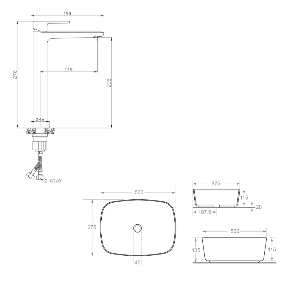 Ceramia PixL 50 x 37,5 x 13,5 cm vasque à poser + Swiss Aqua Technologies Mood mitigeur lavabo XL + Ceramia PixL bonde (CEPX4937SAT285C)