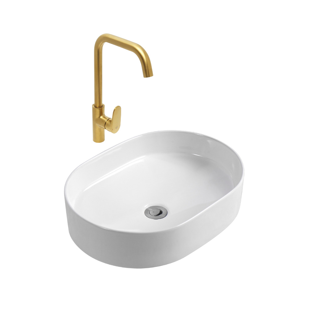 DARK mitigeur lavabo bras pivotant, or + Ceramia PixL 50x36,5x12 cm vasque à poser, sans trop-plein, blanc (SAT280LBZCEPX5037)