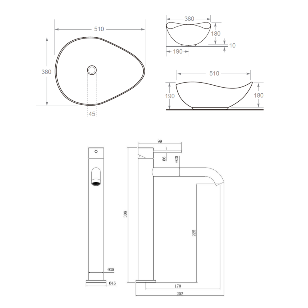 Ceramia Aurum mitigeur lavabo haut 30,8 cm inox, or + Ceramia PixL 51x38x19 cm vasque à poser, sans trop-plein, blanc (SAT285BGCEPX5038)