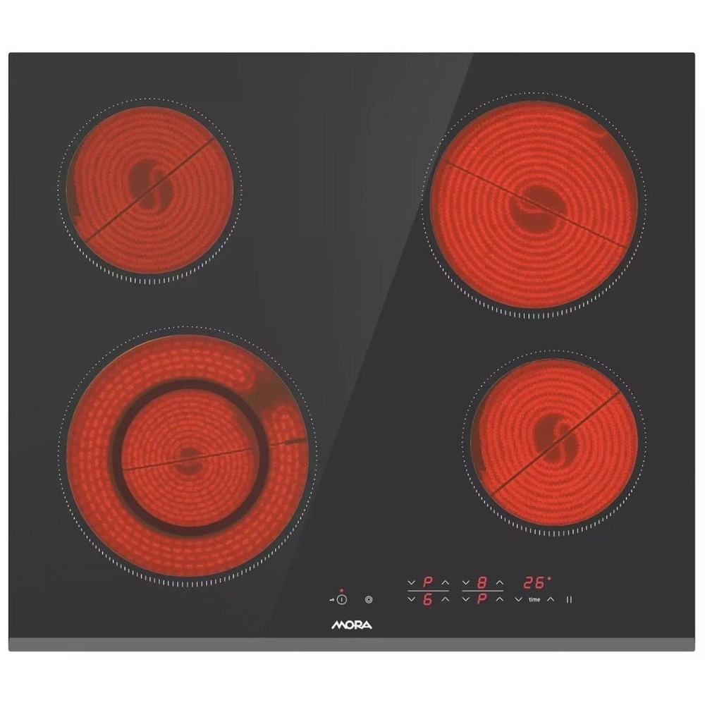 La Plaque de cuisson vitrocéramique Mora a une largeur de 60 cm et est de couleur noire. Le nombre de plaques de cuisson est de 4 et la tension d'alimentation (V) est de 220-240.